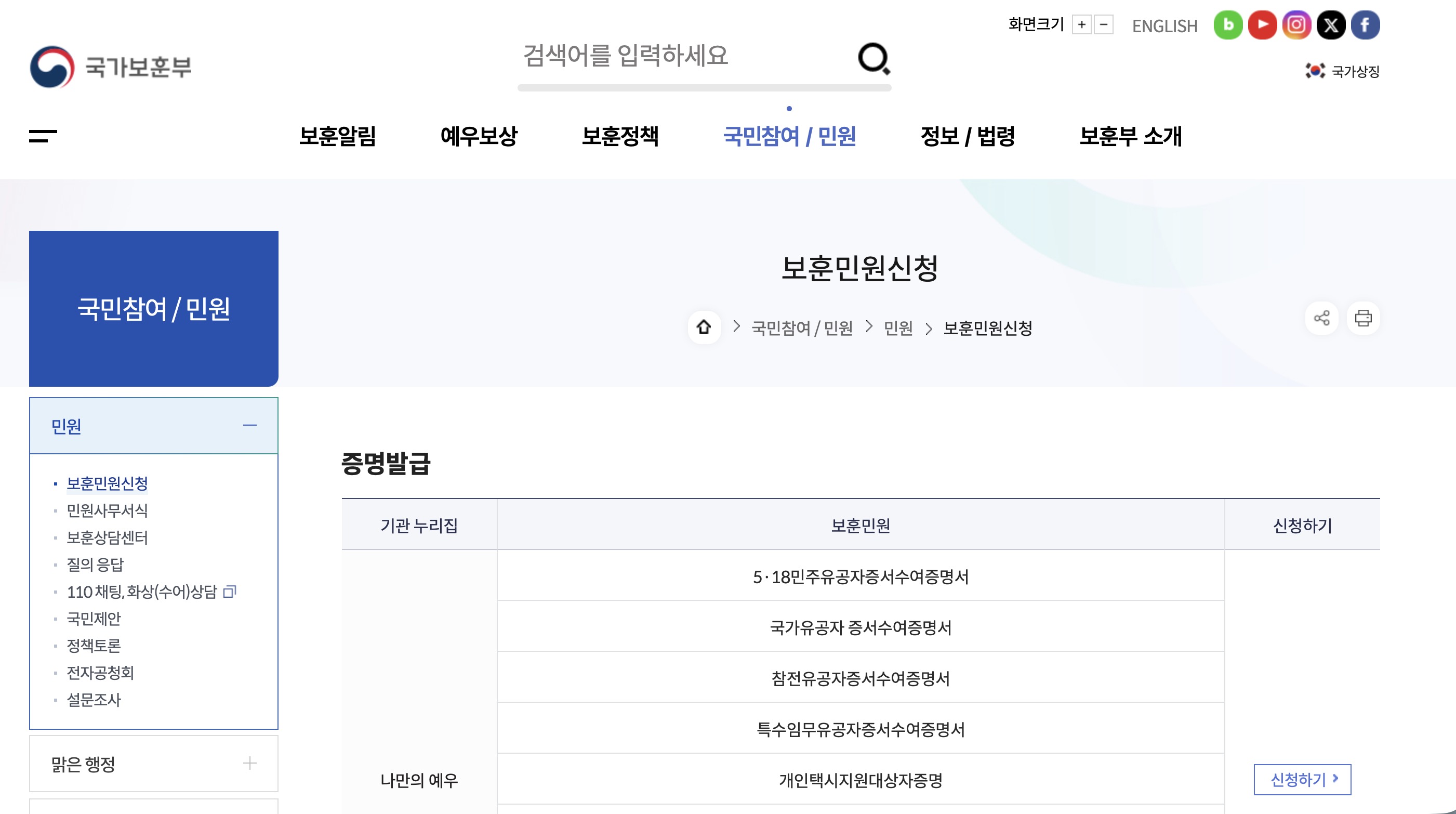 보훈민원신청 - 민원 - 국민참여 / 민원 - 국가보훈부